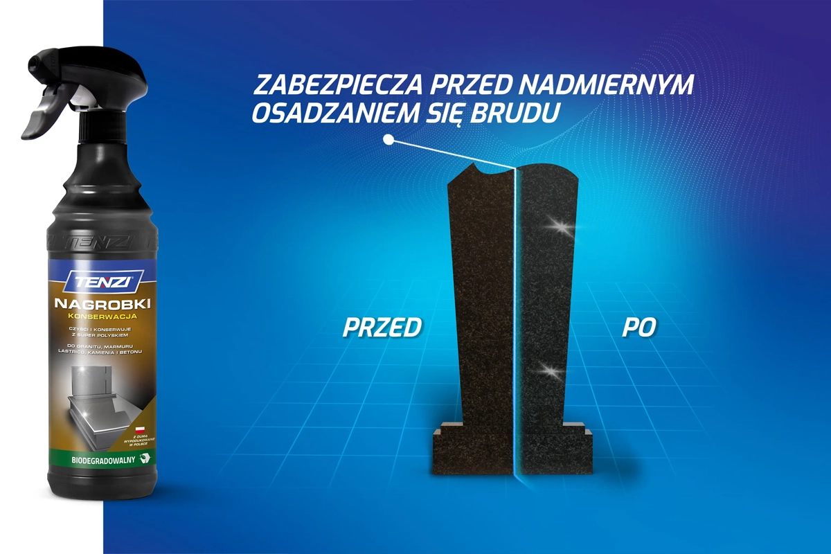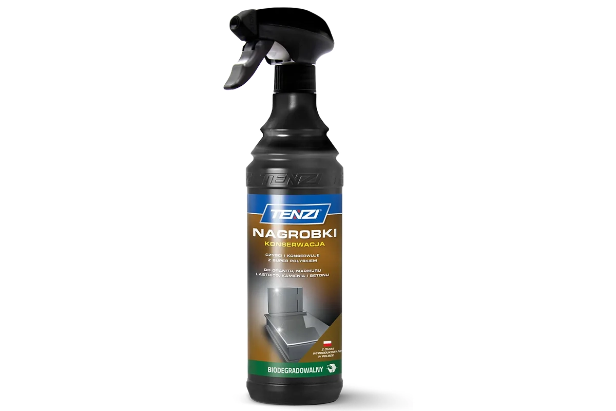 Nagrobki Konserwacja: Długotrwała Ochrona i Łatwiejsze Czyszczenie Pomników. Ten profesjonalny, gotowy do użycia preparat zabezpieczający to klucz do utrzymania estetyki nagrobków z granitu, marmuru, lastriko i kamienia. Skutecznie tworzy warstwę ochronną, która chroni płytę przed nadmiernym osadzaniem się brudu atmosferycznego, znacznie ułatwiając każde kolejne mycie. Regularne stosowanie wydłuża okres czystości pomnika. Aby uzyskać pełne i trwałe zabezpieczenie, należy go nanieść spryskiwaczem na umytą (zalecamy Tenzi Nagrobki Czyszczenie) i suchą powierzchnię, a następnie wypolerować mikrofibrą. Preparat jest bezpieczny dla środowiska – biodegradowalny.